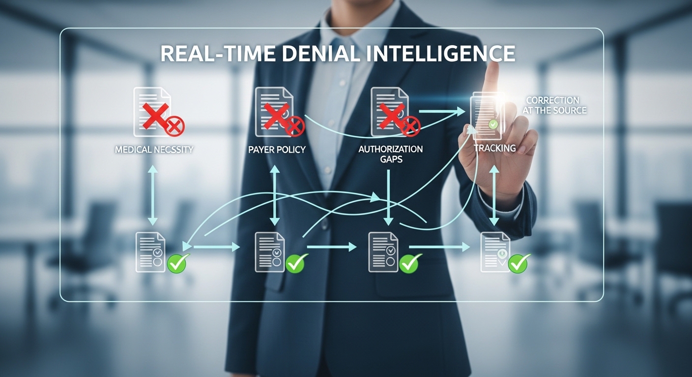Denial patterns tied to medical necessity, payer policy, and authorization gaps are tracked and corrected at the source.