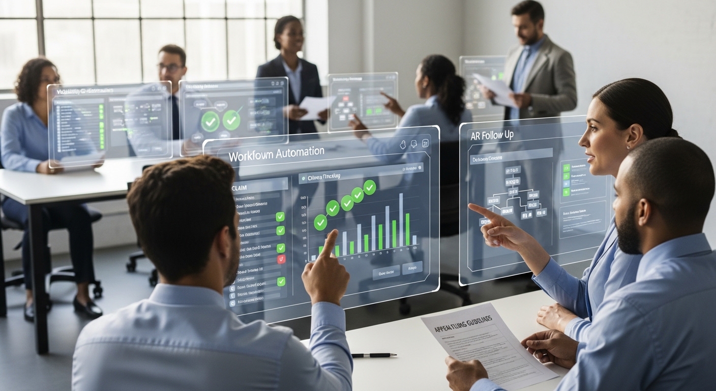 Workflow automation for eligibility, claims tracking, and AR follow-up combined with specialist review for complex denials and appeals.