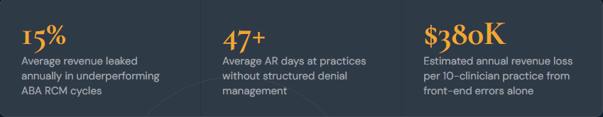 Industry data consistently shows that ABA practices operating without formal RCM oversight lose between 8% and 15% of collectible revenue annually. On a $5M practice, that is $400,000 to $750,000 walking out the door — often silently, across dozens of small failure points that no single report captures.