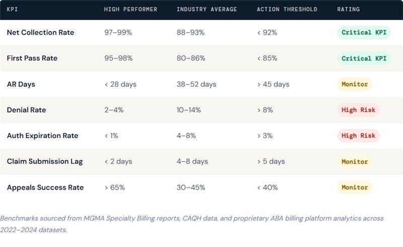 A blended 8% denial rate may be hiding a 22% denial rate from Medicaid and a 3% rate from BCBS. Payer-level granularity is not a nice-to-have — it is the only way to identify targeted intervention points. - Benchmarking against general healthcare, not ABA