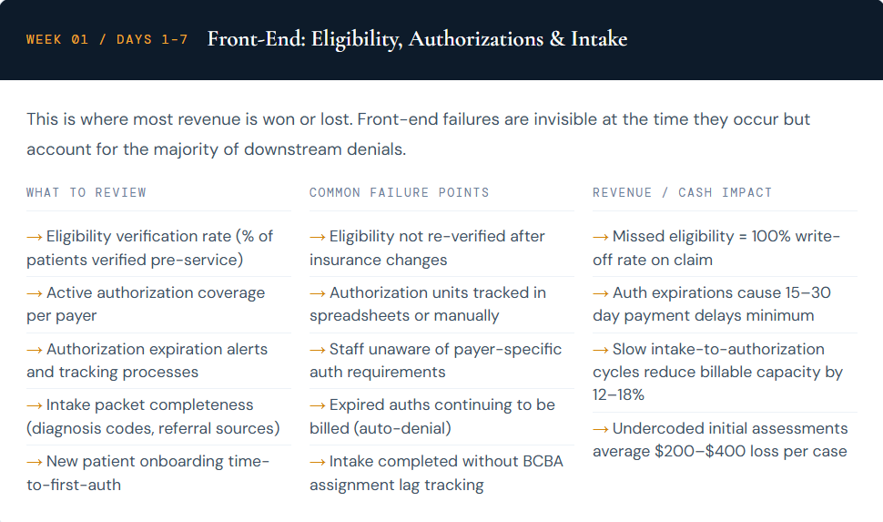 If this audit framework surfaces questions about your current revenue cycle performance, the next step is a structured assessment — not a sales call. We work with ABA operators to identify and quantify revenue leakage, build RCM performance baselines, and design remediation roadmaps that deliver measurable results.