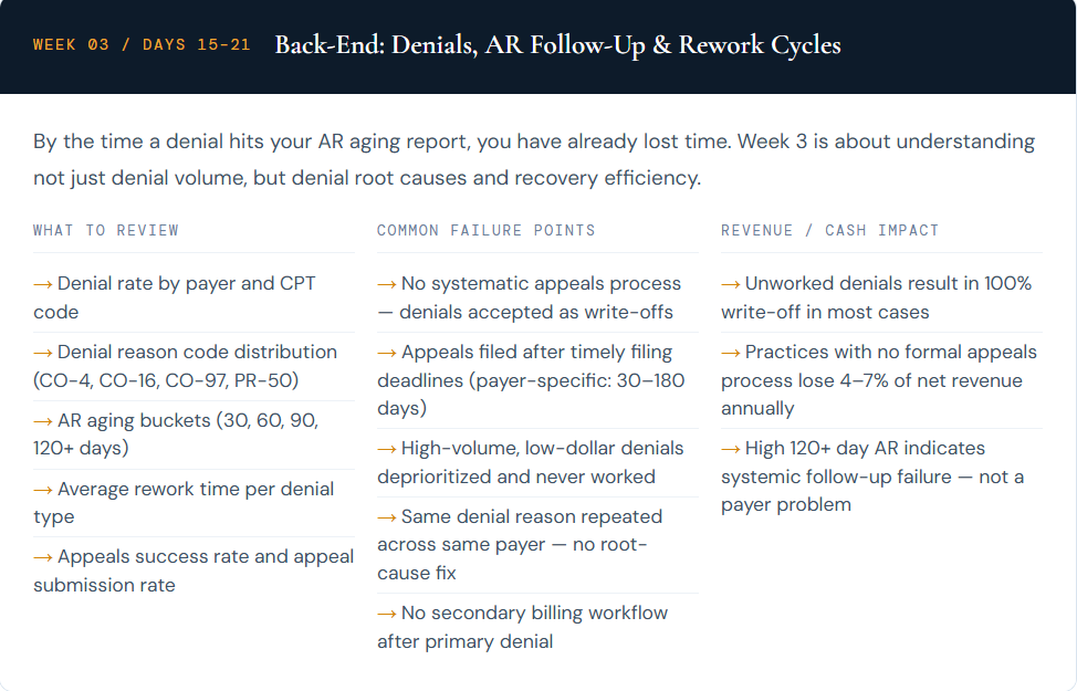 This framework is structured across four sequential weeks, moving from front-end intake through mid-cycle operations, into back-end recovery, and closing with data infrastructure. Each phase builds on the last — the findings from Week 1 directly inform where to look in Week 3.