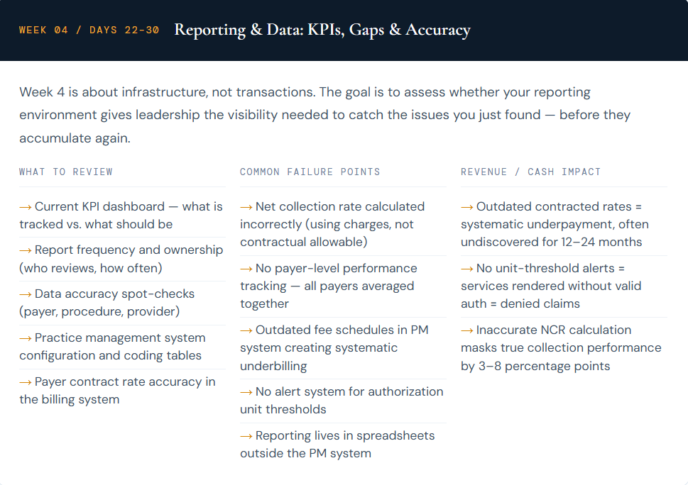 Revenue cycle audits fail because they measure symptoms, not systems. The 30-day framework below is designed to reverse that — building a full-cycle diagnostic that maps failure points to their source, not their consequence.